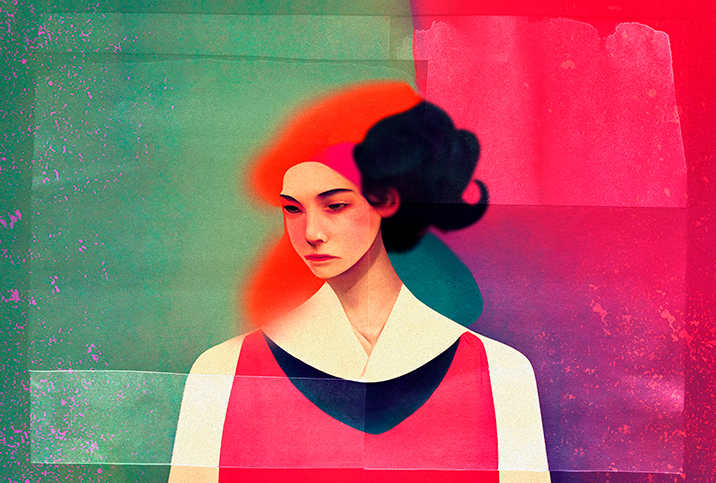 An illustrated woman with red and black hair looks sideways with a serious expression.
